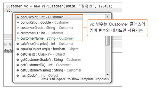 - VIPCustomer()생성자에 의해 VIPCustomer 클래스의 모든 멤버변수에 대한 메모리는 생성됐지만, 변수의 타입이 Customer 이므로 실제 접근 가능한 변수나 매서드는 Customer의 변수와 매서드이다.