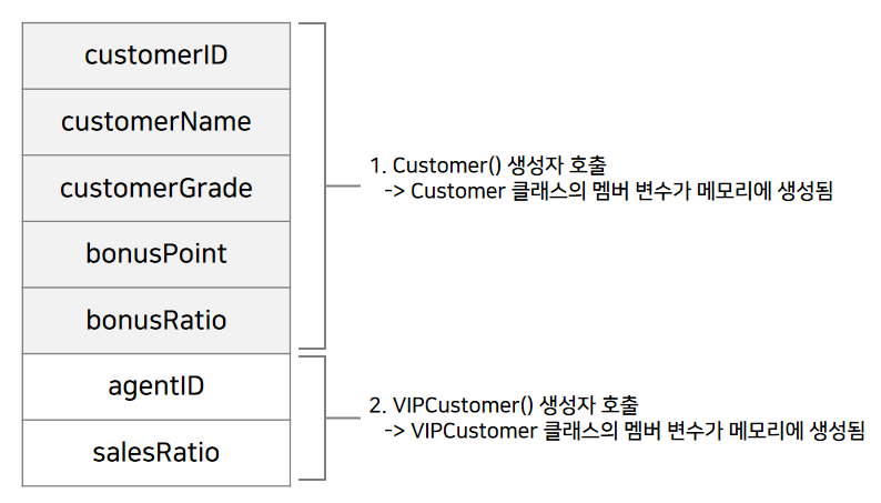 - new VIPCustomer()를 호출하면 Customer()가 먼저 호출됨